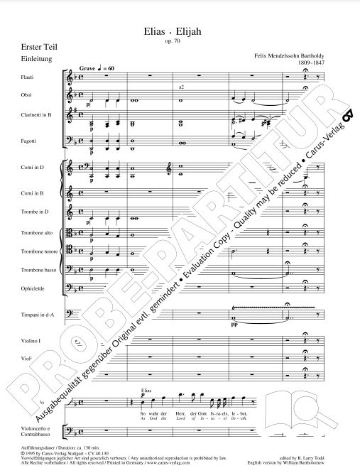 "Bei einem solchen Gegenstand wie Elias ... muß das Dramatische vorwalten... die Leute lebendig redend und handelnd eingeführt werden, ... eine recht anschauliche Welt, wie sie im alten Testamente in jedem Kapitel steht," schrieb Mendelssohn an seinen Librettisten. Die "anschauliche Welt" setzte er in packenden Baalschören, dramatisch durchkomponierten Szenen und schlichter Engelsmusik um. Die Carus-Neuausgabe von R. Larry Todd, Duke University/USA, gibt ausführliche Informationen über Entstehungsgeschichte und Quellenlage.